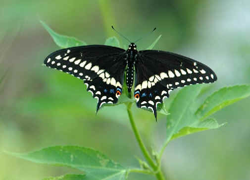 One Tiger Swallowtail is black. On the same